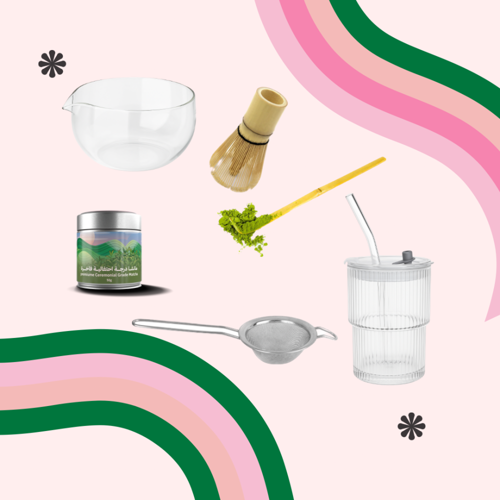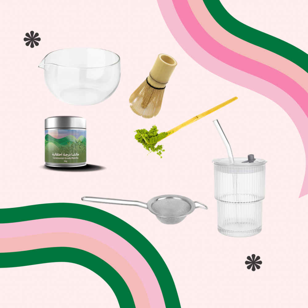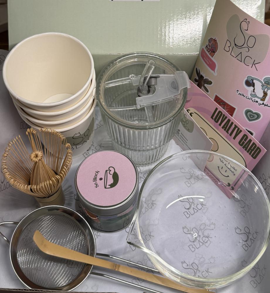 محتويات البوكس 8 :ماتشا 50g النوع حسب اختيار العميلصحن الماتشاخفاقةملعقهمشخالكوب زجاجي مع غطاء واسترواكواب ورقيةستيكرات سو بلاك