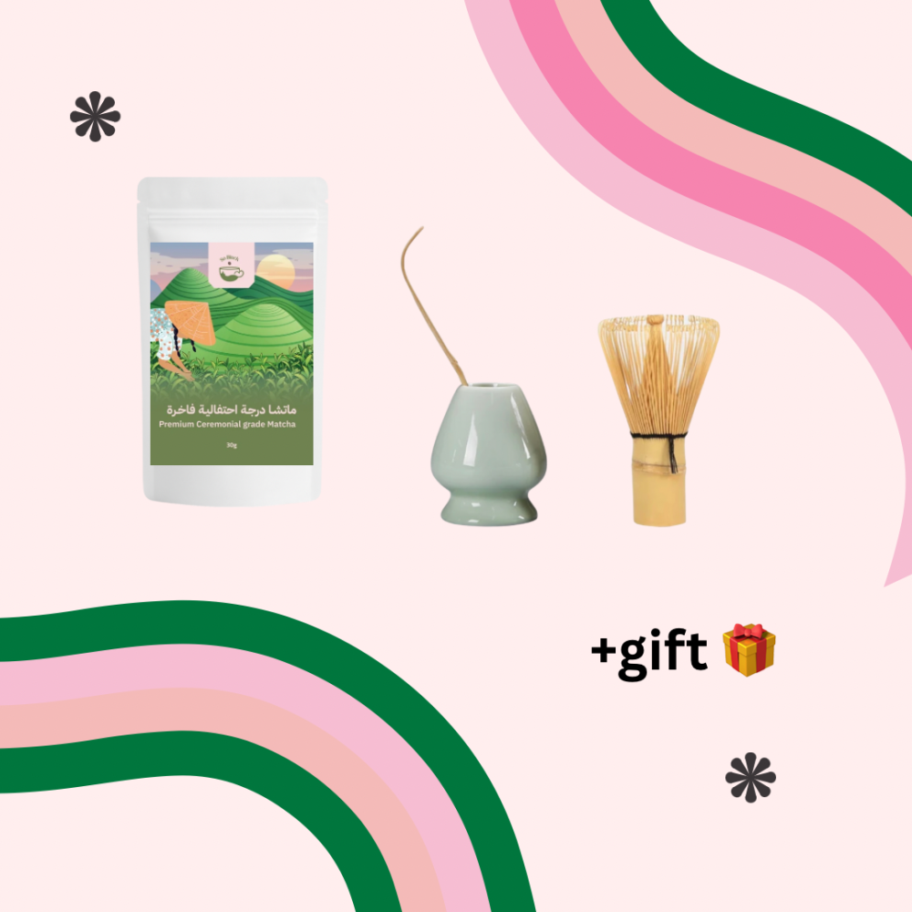 يحتوي البوكس على 6 محتويات :ماتشا درجة احتفالية فاخرة ٣٠ جرامخفاقة ماتشا ( ويسك )حامل خفاقة الماتشاشاشاكوأكواب ورقيةستيكرات سو بلاك