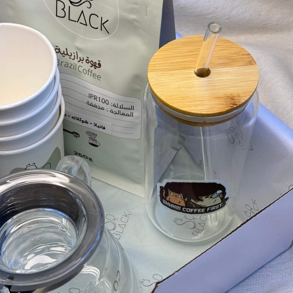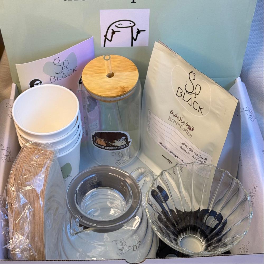 يحتوي الكوب على :بن قهوة برازيلية 250gإبريق V60فلتر V60قمع V60كوب حسب الاختياراكواب ورقيةستيكرات سو بلاك